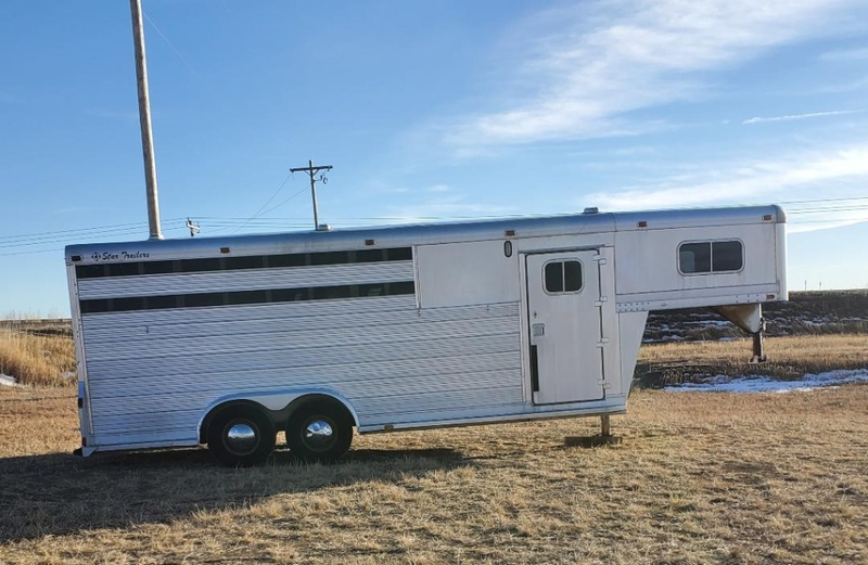 Four horse trailer, center doors rear hooks, saddle/dressing room, with custom detachable step for dressing room entrance;20 bridle hooks, saddle rack for 4 saddles, water container. Removable tinted plexiglass for slatted openings & door for winter use, 5 roof vents, 7'6" ceiling height, good tires and spare included, 6 running lights at roofline on each side, 5 running lights across back, 2 across front. Interior lights & exterior light at loading area & dressing room door. Four door keys. Padded dividers, metal hooks. Drop face windows with screened slide openings. This trailer pulls smoothly and horses are contained with plenty of room. Tie rings on both sides of exterior. No accidents.