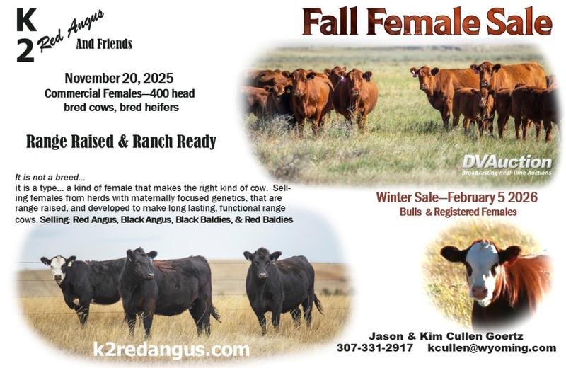 10th Annual K2 Red Angus Fall Female Sale, Nov 20th. 400 head selling; Red & Black Angus, Red & Black Baldies. Live auction at K2 Red Angus Wheatland, WY & online at DVAuction.com ]]>307-331-2917, k2redangus.com